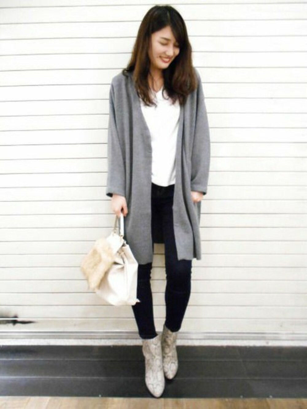 トレンドのロングコーディガンはすっきりスキニーで合わせて 足元をパイソン柄のブーツにしてみました^^ 長すぎない丈感なのでワイドパンツなどでも合わせていただけます☆