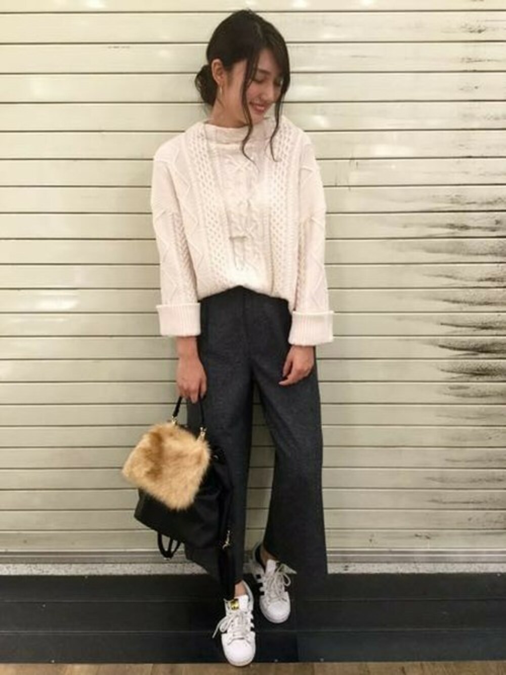 ケーブル編みが可愛いニットです! 丈が長すぎないのでワイドパンツ合わせでも◎! スニーカーにリュックでカジュアルにまとめてみました☆