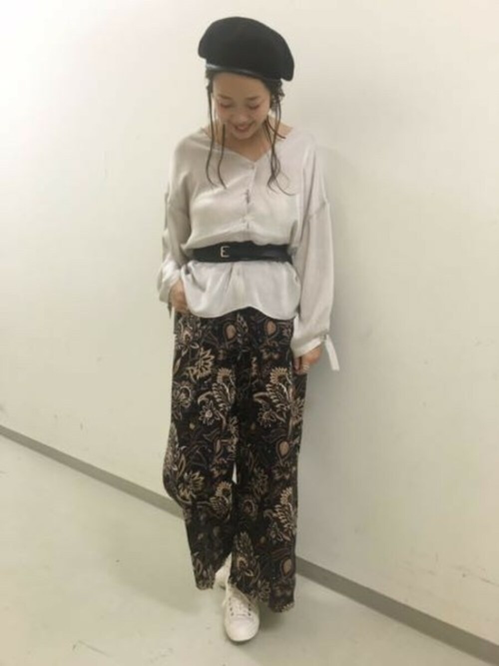 てろっとしたブラウス×ワイドパンツの組み合わせには 太めのベルトでウエストマークが鉄板! まとめ髪にベレーを合わせればさらにすっきりスタイルUP☆☆