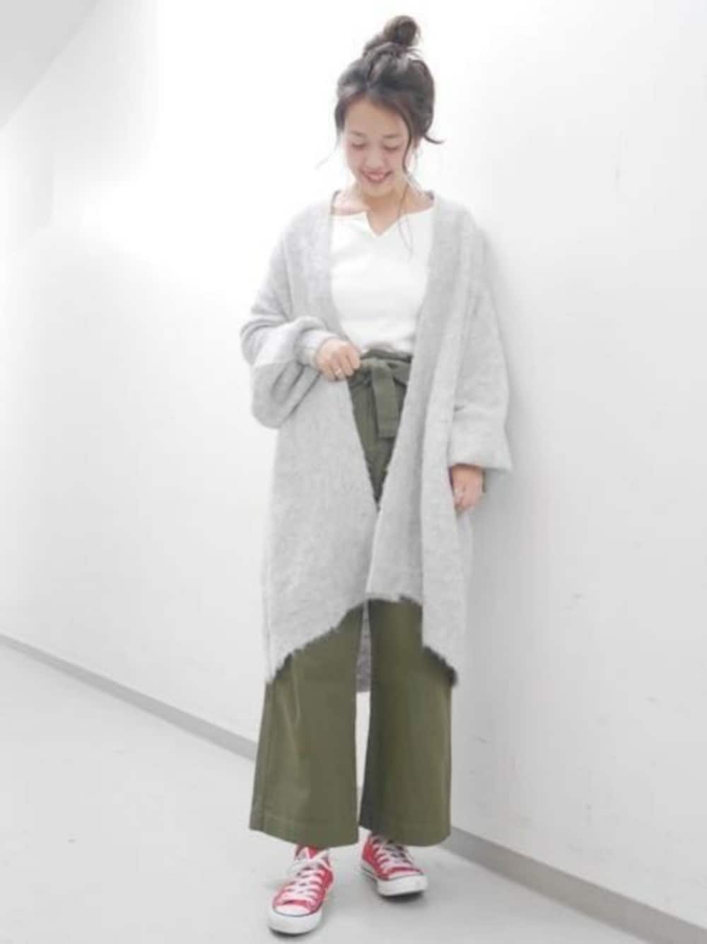 カーディガンとトップスが 淡いカラー&ゆるシルエットなので カーキのパンツでメリハリを★