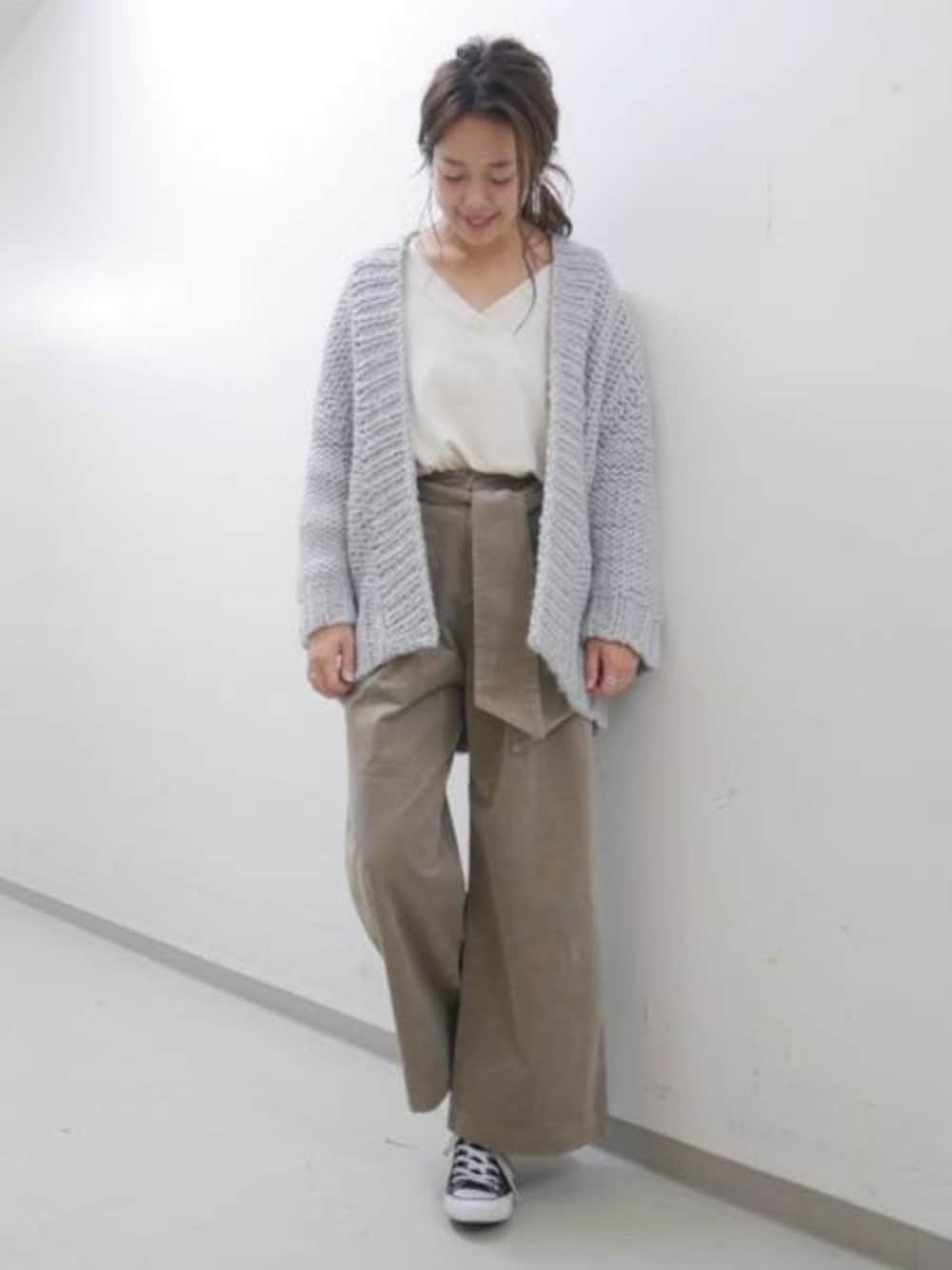 ざっくりニットが可愛いカーディガンは、 ミドル丈でワイドパンツやスカート合わせにぴったり! トレンドのコーデュロイのワイドパンツを合わせ、 すっきり柔らかく女性らしいスタイリングに★
