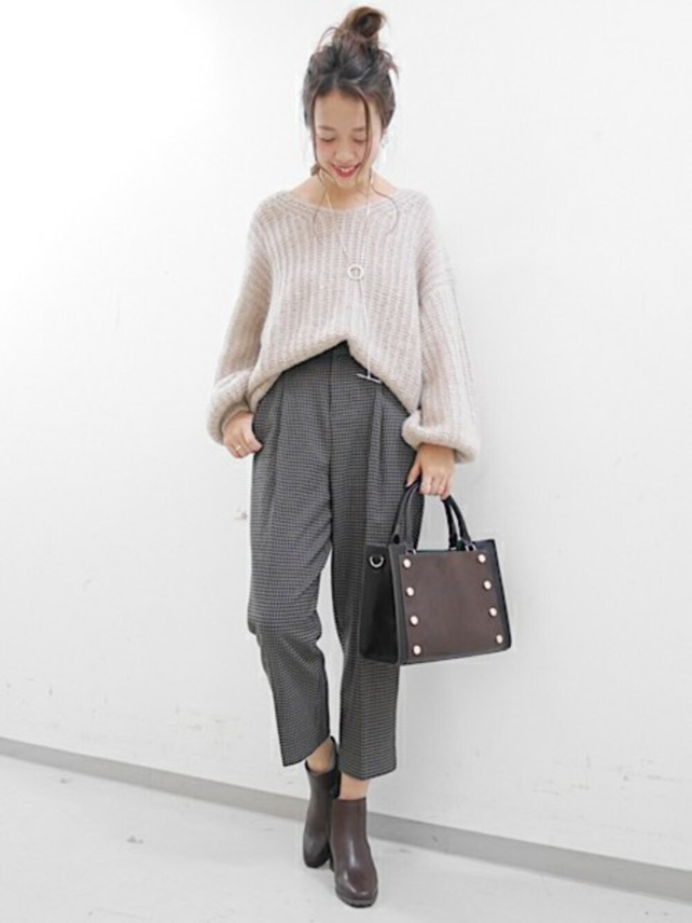 キレイめなテーパードパンツには ルーズなざっくり編みニットを合わせて 女性らしく♪ 柔らかいカラーで統一感のある スタイリングです!