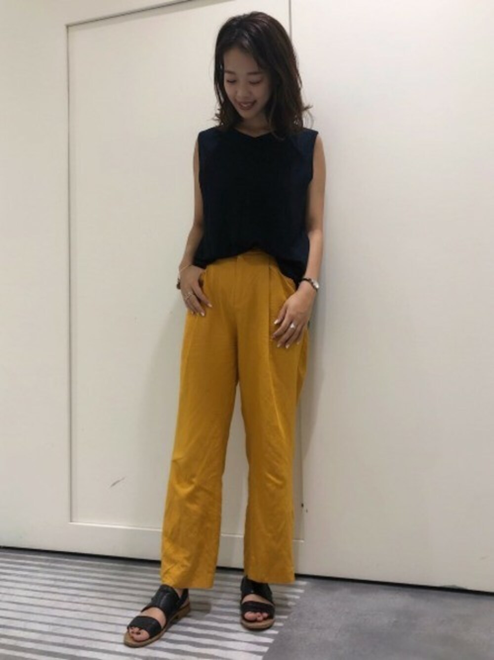 トレンドのイエローは秋に向けて落ち着いた色味が気分☆ シンプルなスタイリングでパンツを主役に!