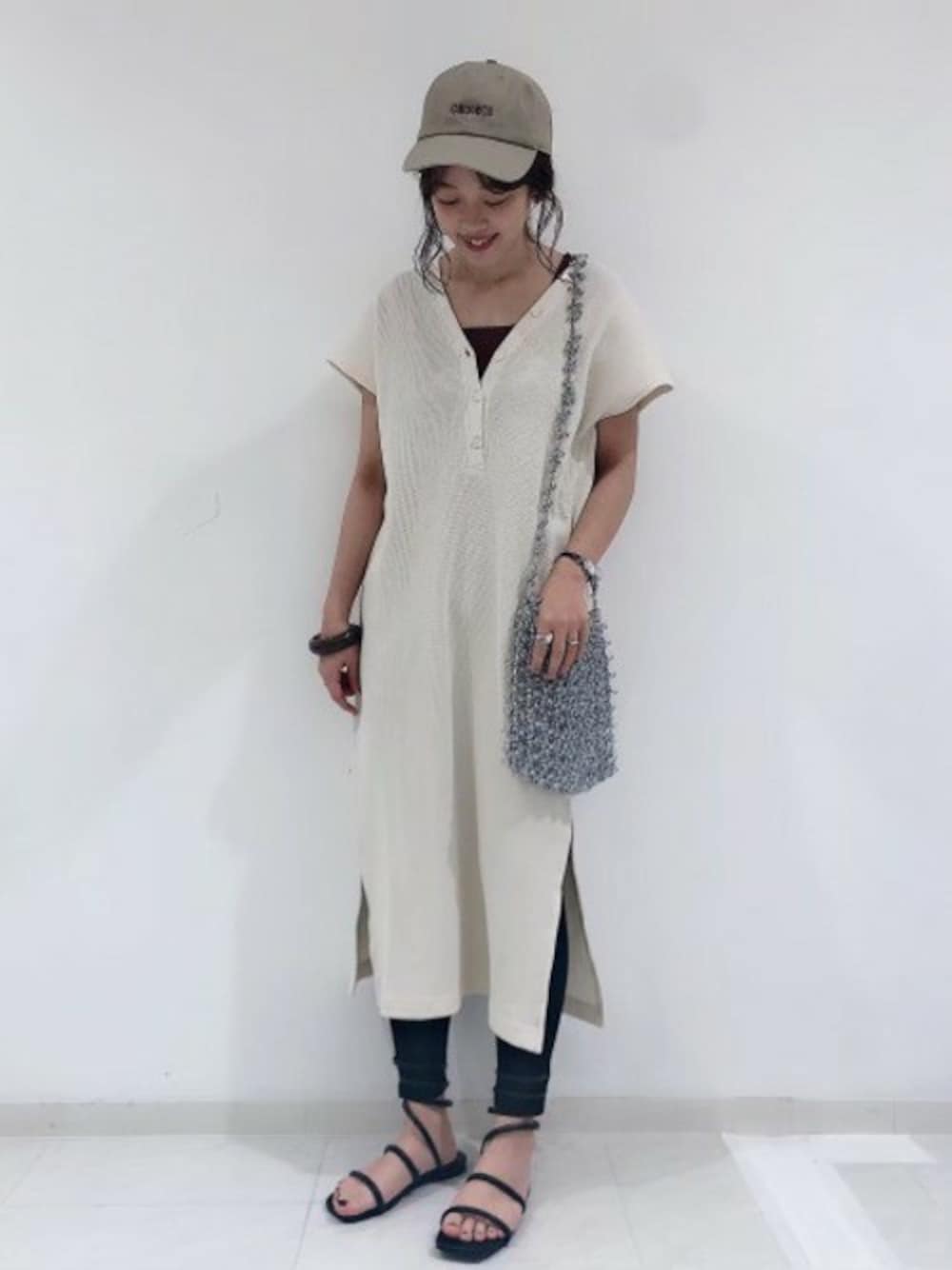 フレンチスリーブと広めに開いた胸元で程よい肌見せが涼しげなスタイリングです! シンプルなコーディネートはバックや靴など小物で個性的に(^^)