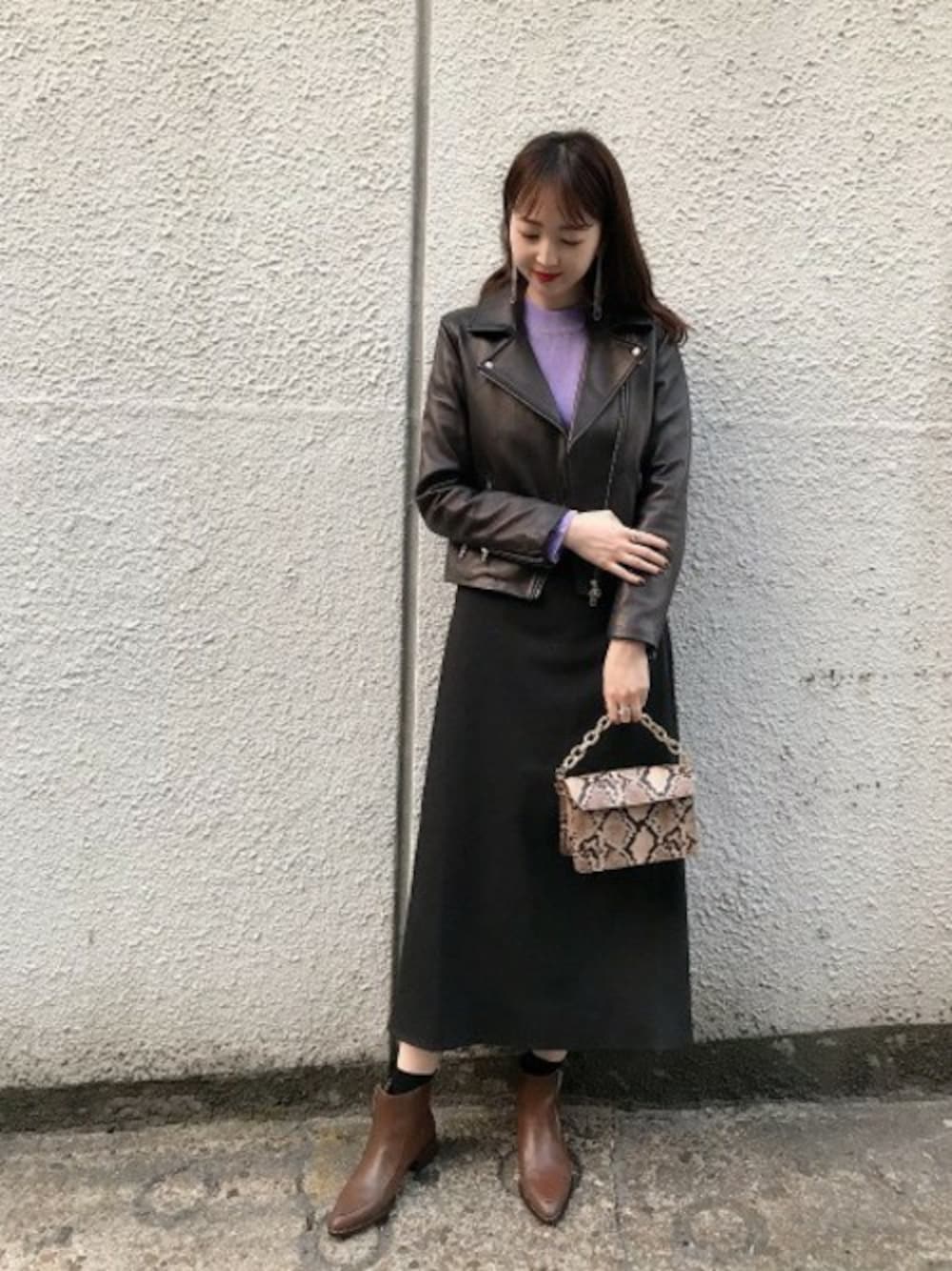 レザージャケットや、パイソンで甘すぎないスタイリング★ インナーで雰囲気が変わる2wayワンショルジャンスカは重宝間違いないです^_^
