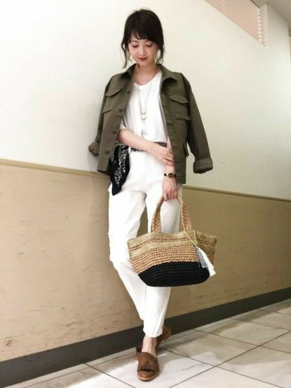 カーキのジャケットが引き立つワントーンコーデ☆ 小物で季節感を出すと、初夏にぴったりなワンランク上の着こなしに♪ トレンドのスカーフは腰に巻いてベルト風にも◎