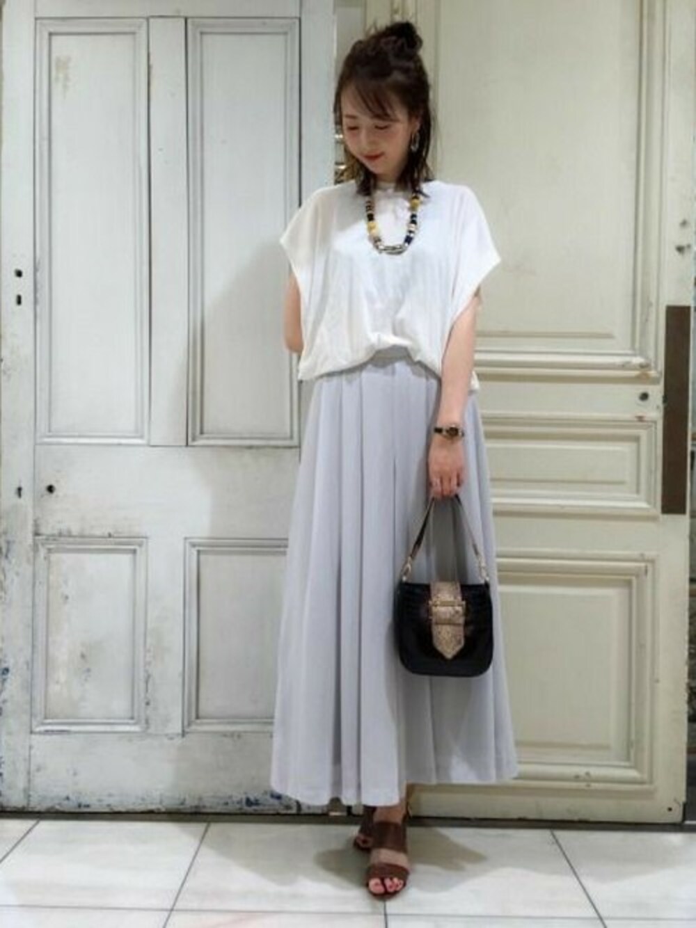 爽やかな色合いに、アクセントになる柄BAGをプラスした 大人モードなスタイリングです♪ カラフルなネックレスで夏っぽく^^