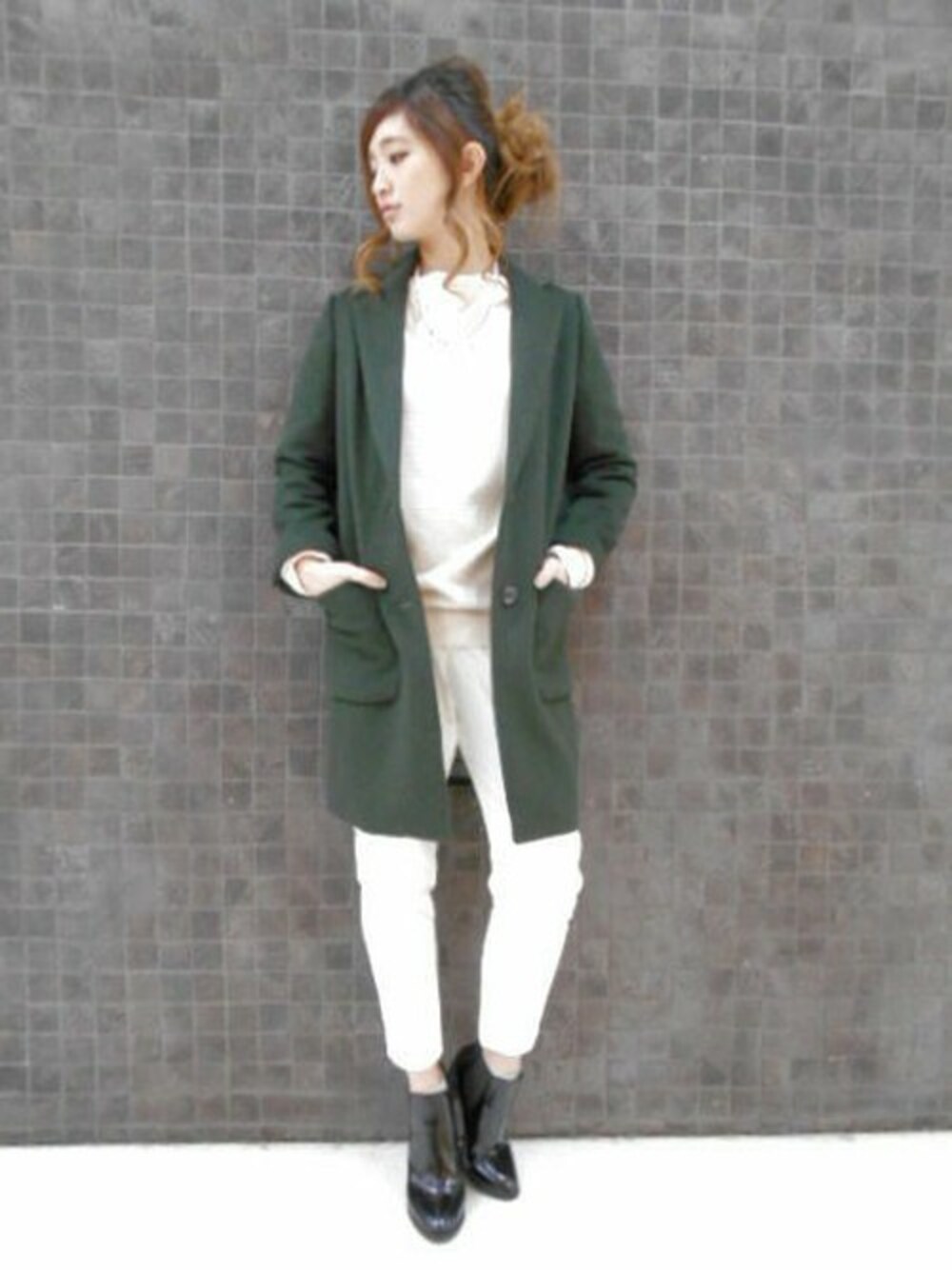 中をオールホワイトでまとめてカーキのコートで存在感のあるコーディネートに。 縦ラインがつくれてスタイルアップに見えます!