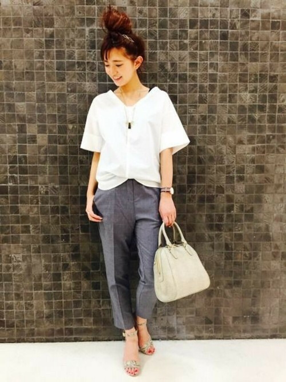 今の時期に羽織ものなしで1枚で着られるシャツを主役にしたコーデ! 襟はVネックでスッキリした印象に♪ トラウザーパンツと合わせると、オンでもオフでも使えるコーデに◎