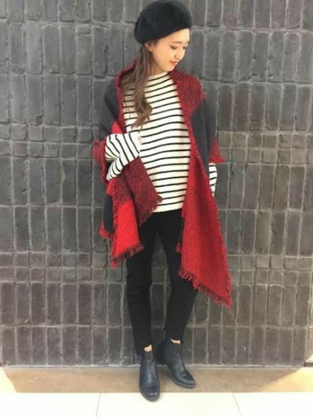 ストールがポイントのカジュアルコーデ☆ 全体をモノトーンで合わせることで赤が映えます!!