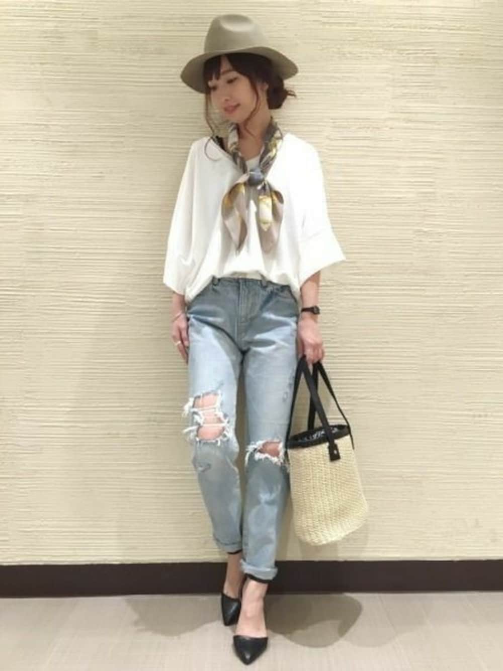 トレンドのとろみトップスには、 テーパードパンツとスカーフでキレイめな雰囲気に★ 雑材素材のバッグをプラスして春気分♪
