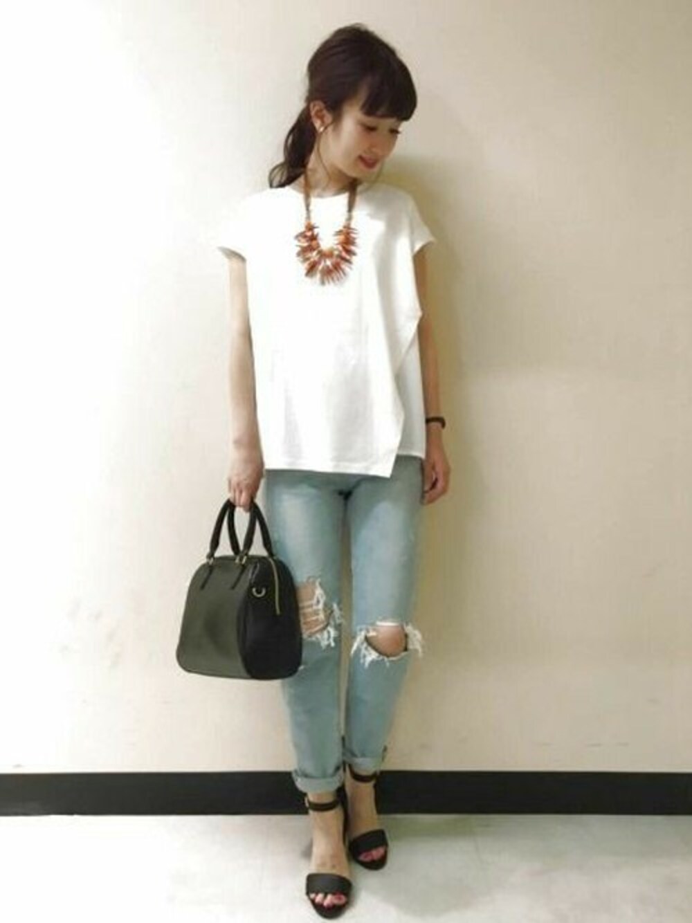 定番の白Tシャツを使ったこの夏イチオシのスタイリングです!! クラッシュデニムを履くことでカジュアルに☆ サンダルとバッグはブラック合わせでシックな印象に!