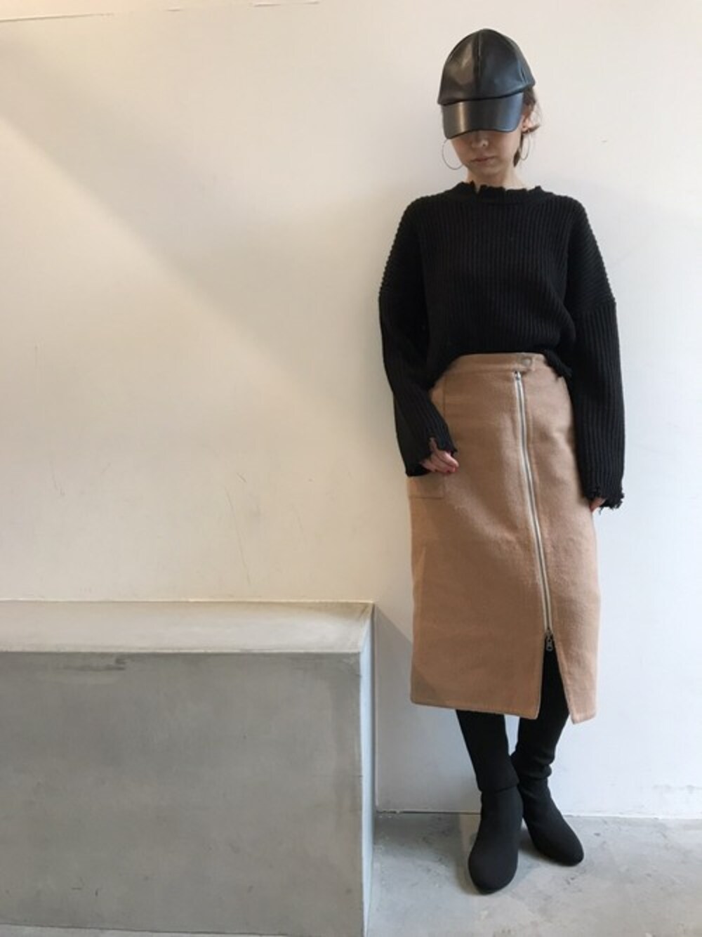 ブラックを基調としたコーデ‼︎ キモウのスカートをカッコよく着こなしたいならコレ‼︎って思いました♪ ニーハイブーツで、あえて足をかくすのが新鮮なスタイル‼︎