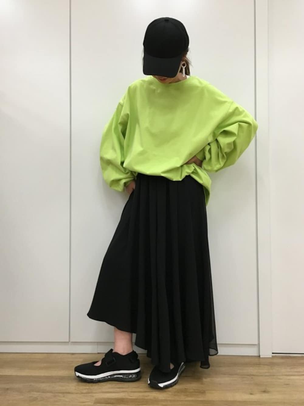 ライムのBIGロンTEEが1枚で主役になるスタイリング! カジュアルになり過ぎないようにフレアスカートでバランスをとるのがポイント☆