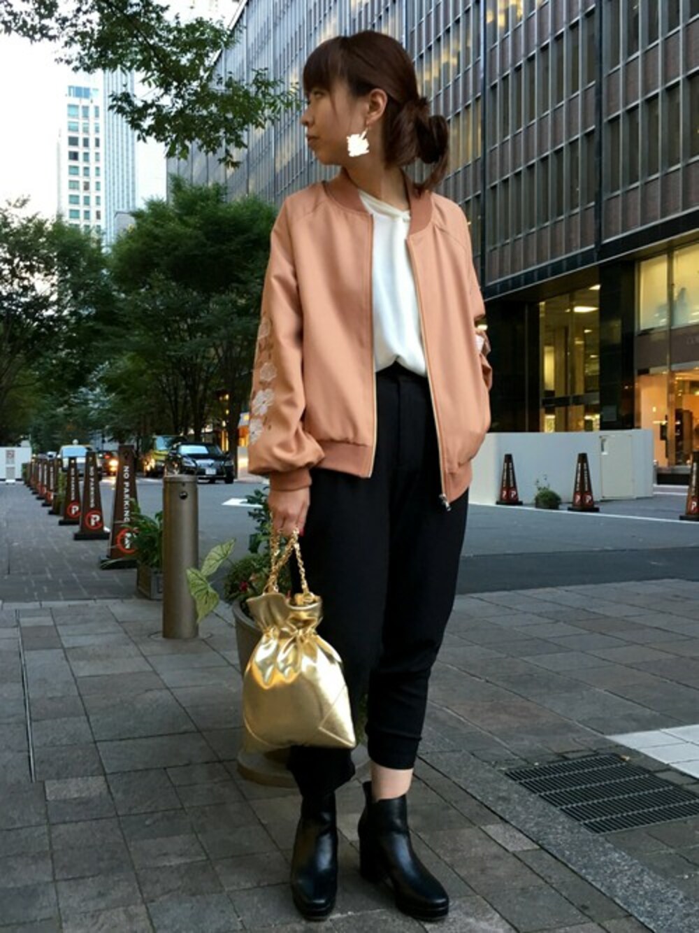 今年チャレンジしてみたい刺繍ブルゾン♪若く見えすぎないようにキレイにカッコ良く着こなしました‼︎淡いピンクが黒と相性◎