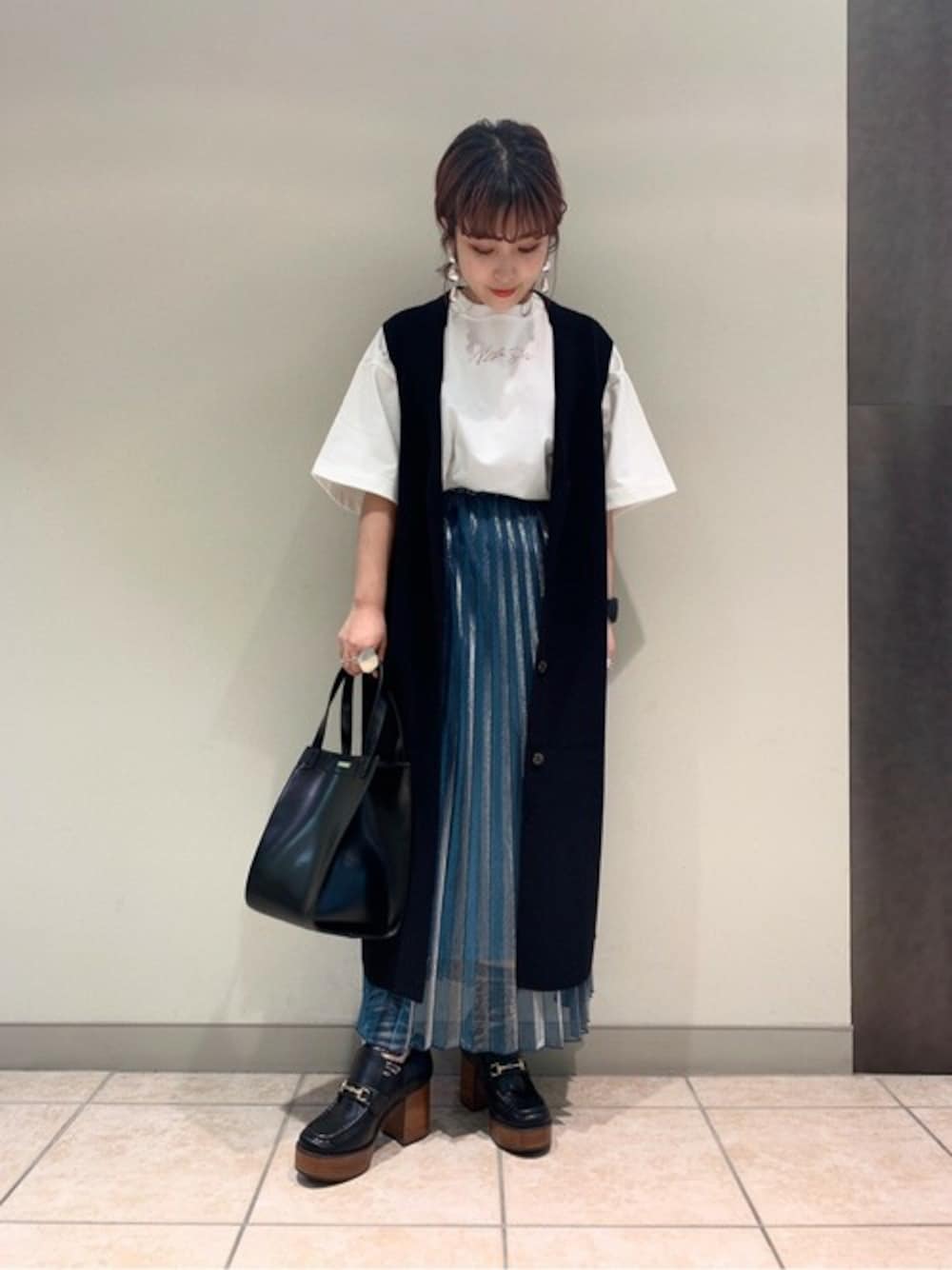 夏にぴったりのブルーのスカート☆ 裾がシアーになっていて、小柄な方も取り入れやすいロングスカートです! 今季トレンドの、ジレを重ねてアクセントに♪