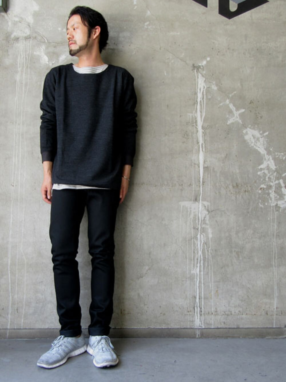 ヘリンボーンダブルフェイスプルオーバー GRAY ¥16,000+TAX 高密度コットンボーダー 7分袖 GRAY ¥12,000+TAX リジットデニム テーパード BLACK ¥17,000+TAX