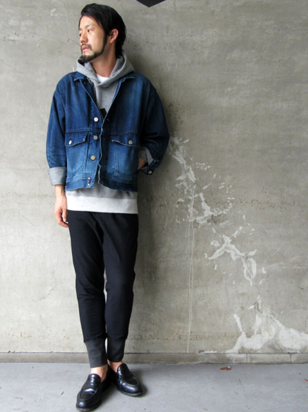 カスタムコーティングドロップ Gジャン INDIGO ¥30,000- ファーパイル裏毛刺繍フードプルオーバー GRAY ¥22,000- カルゼジャージリブパンツ NAVY ¥20,000-