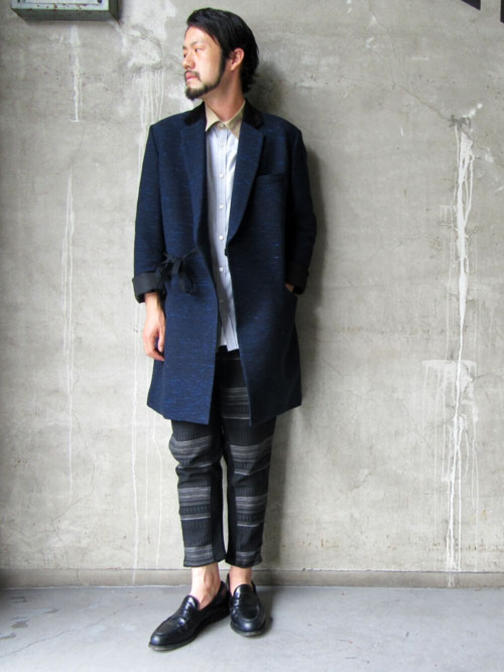 コットンウール Wブレストコート NAVY ¥49,000- ALBINI クレリックシャツ GRAY ¥23,000- アイヌジャガードジョッパーズパンツ BLACK ¥26,000-