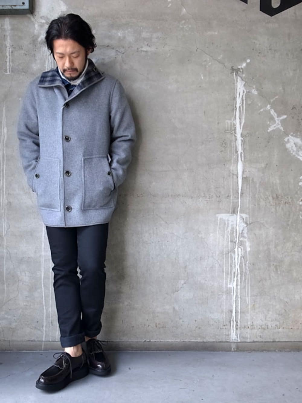 FACTOTUM nagoya 2015 Autumn / Winter COLLECTION STYLE アウター:ウールカシミアボンディングフードコート GRAY ¥90,000- インナー:ドロップショルダー Gジャン INDIGO ¥30,000- インナー:ウォッシャブルウールタートルネック WHITE ¥16,000- パンツ:リジットデニム スリム BLACK ¥17,000- シューズ:チロリアンシューズ BROWN ¥55,000-