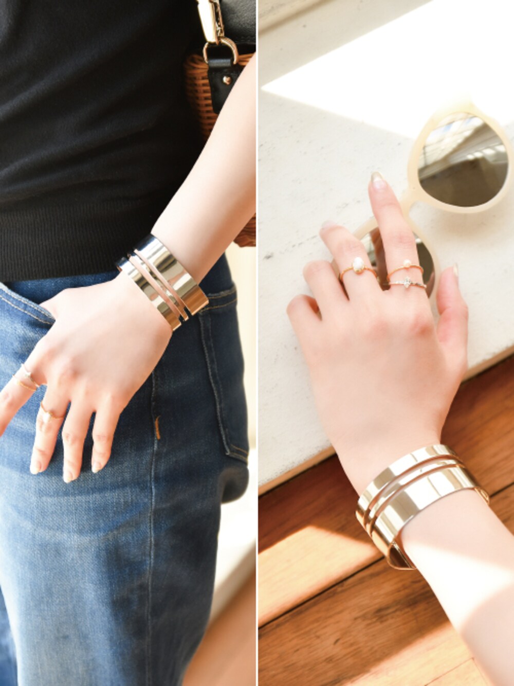 いつもJewel Addict WEARをご覧頂きありがとうございます☆ 夏の日差しにぴったりな、リング×バングルコーディネートをご紹介します♪ リングの重ね着けとワイドバングルでボリュームを出せば、腕だしコーデもすっきりと楽しめます。 今年は去年よりも幅のある、ワイドデザインが人気です! phoebe新作のバングルは、抜け感のあるデザインがポイント。 重く見えず、コーディネートに取り入れやすく大人気です☆ リングは華奢なデザインを重ねて、手元に華やかさをプラス。 3本セットのコスパ抜群なセットリングは、それぞれに夏の日差しに映えるテクスチャーを施しました。 リゾート感も出せる天然石がアクセントになり、コーデをいっきに夏らしく更新します♪ phoebeでは、夏の日差しを味方に出来る新作が続々入荷中☆ カラーストーンやウッドビーズなどの、この季節ならではの素材を是非お楽しみください!