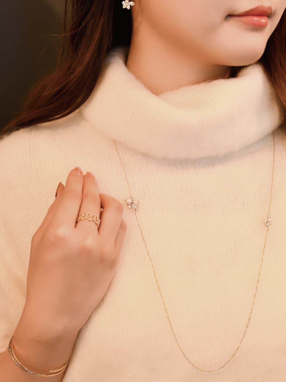 繊細さをアピールしたいクリスマスデートに・・・♪ レースデザインが手元を印象的にいろどる、ビジューが煌めくリング。 ニットの上を流れるパールビジューが冬のイルミネーションに映えて、コーディネートをロマンティックに仕上げます。