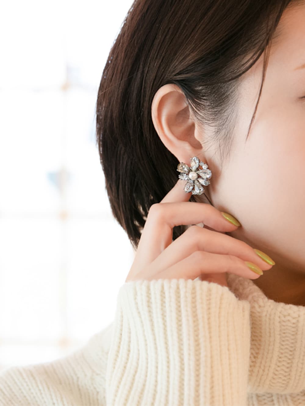 白ニットにビジューピアスをプラスして華やかに♪ 3wayブリリアントビジューピアス シルバー ¥4,536 taxin