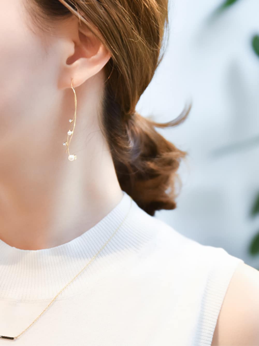 ゆれ感とパールが女性らしいピアスをプラス♪ ツインカーブラインパールビジューピアス ¥3,888 taxin