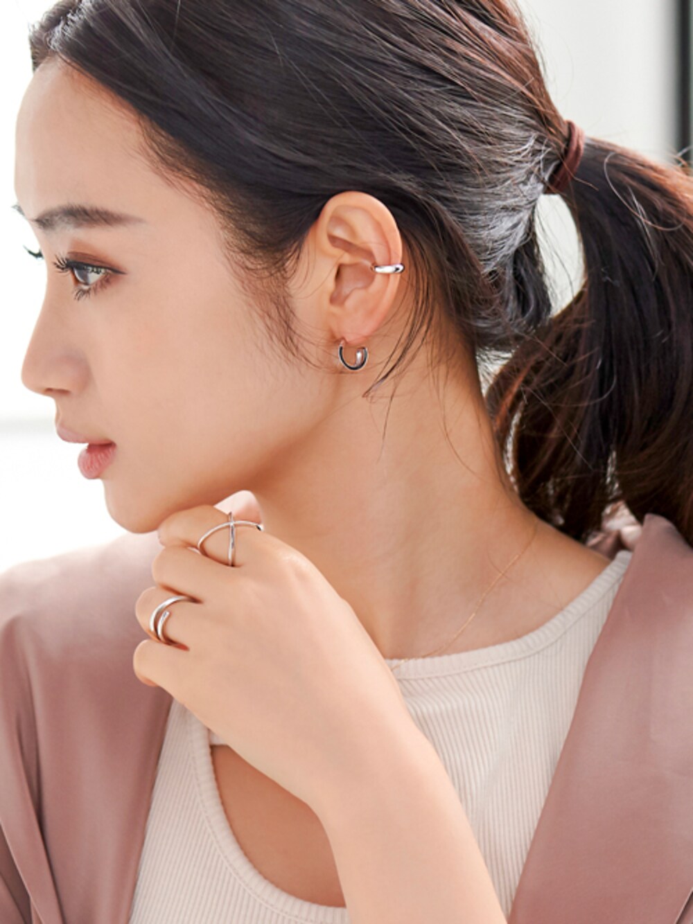 JEWEL ADDICT STAFFのピアス(両耳用)「【SV925】シンプルフープピアス&イヤーカフ/セット」を使ったコーディネート