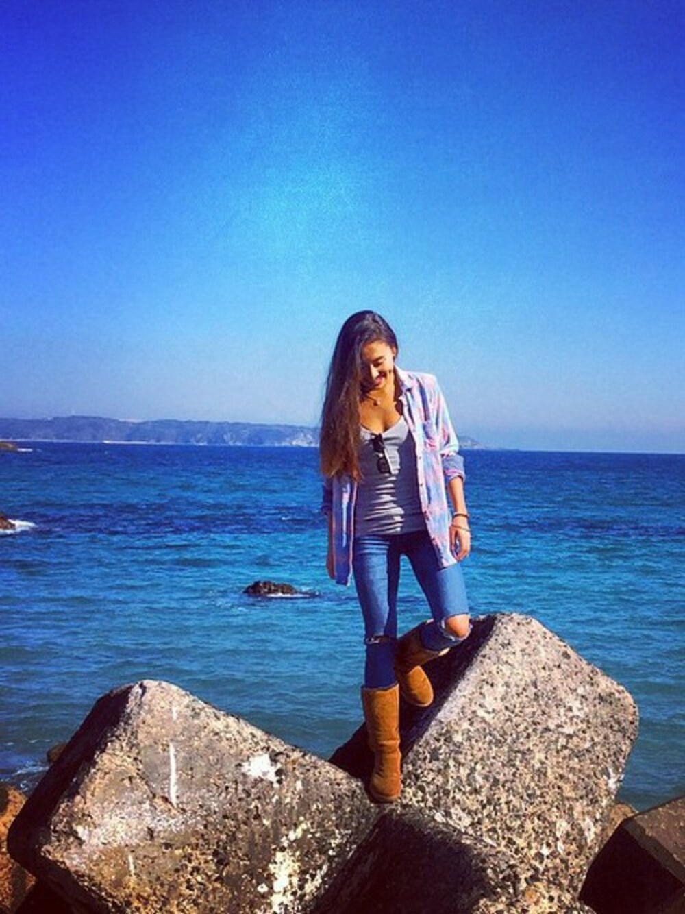 日差しはとても暖かいけれど、冬の匂いを感じる冷たい空気 そんな日の日中はshirt を羽織るくらいが このroxy のShirt は薄手のcorduroy のような生地がいい感じ 風邪をひいていたからlong sheepskinbootsdenim で定番のbeachstyle 足元ぽかぽかで丁度良かった〜正解♥