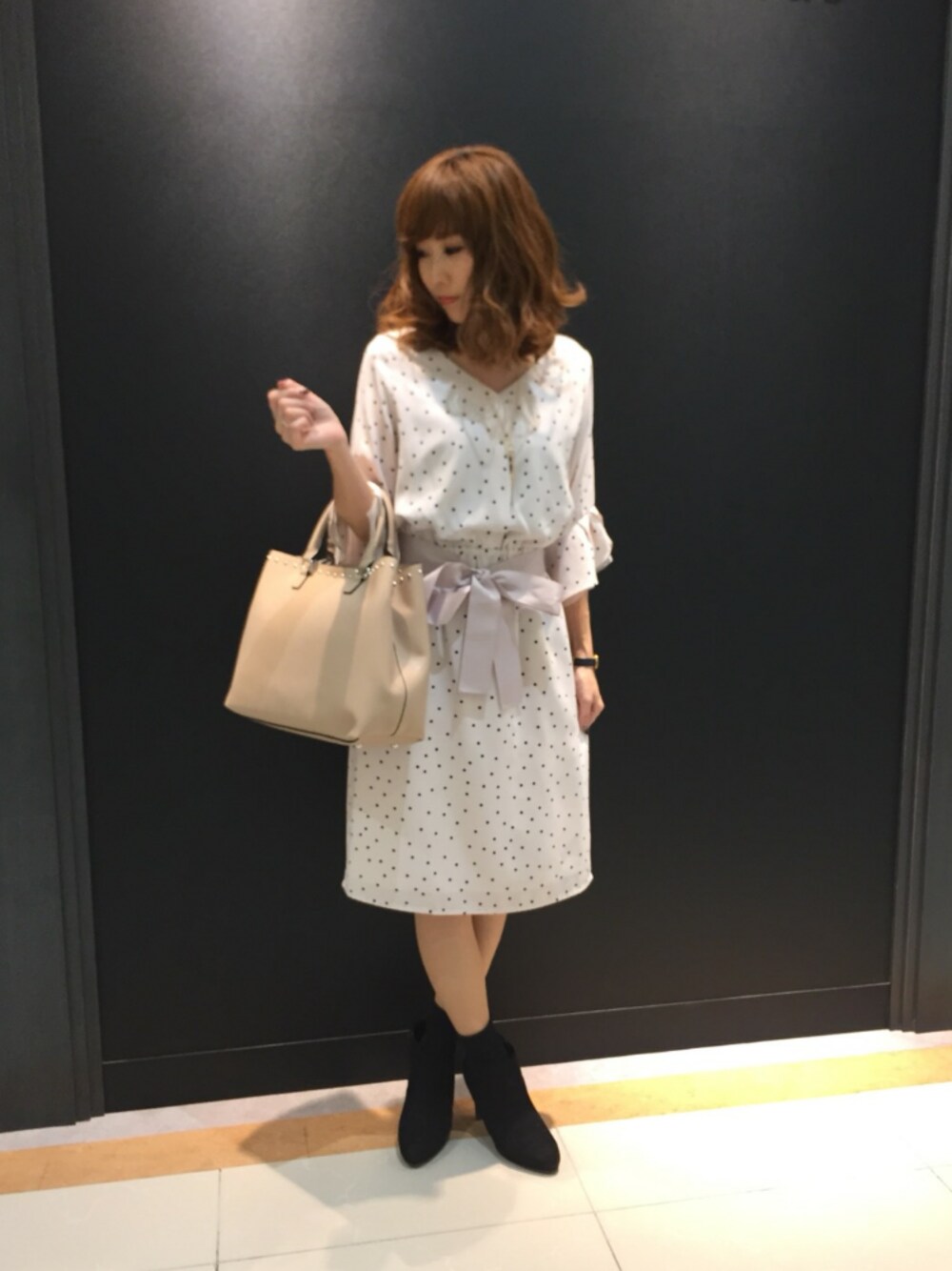 🎶もぉすぐ春ーっですねぇ🌸(笑) そろそろ1枚で着て歩きたいですね✨ このワンピース👗は、今年トレンドのドット柄で背の高い私でも短すぎない丈になってます(*´ω`*) とっても上品に見せてくれますよ✨←私のようにたとえ、そうぢゃなくても☺️❤️ そして暖かくなってきたので、靴下にショートブーツ合わせてにしてみました✨ 今日もご覧頂きありがとうございます(*´ω`*)✨