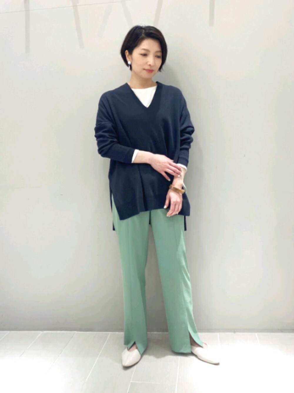 いつもご覧頂きありがとうございます。 春はカラーパンツな気分♪ 【qualite 】定番素材の“2WAYストレッチパンツ”の新しいシルエットは、センターベンツ。 程よく太ももから離れるシルエットとセンターラインで脚長効果が嬉しいパンツです(^^) ◆Vネックドレープニットプルオーバー No.32410040021 ◇【限定】サイドスリットロンT No.32412020004 ◆2WAYストレッチセンターベンツパンツ No.32420050008