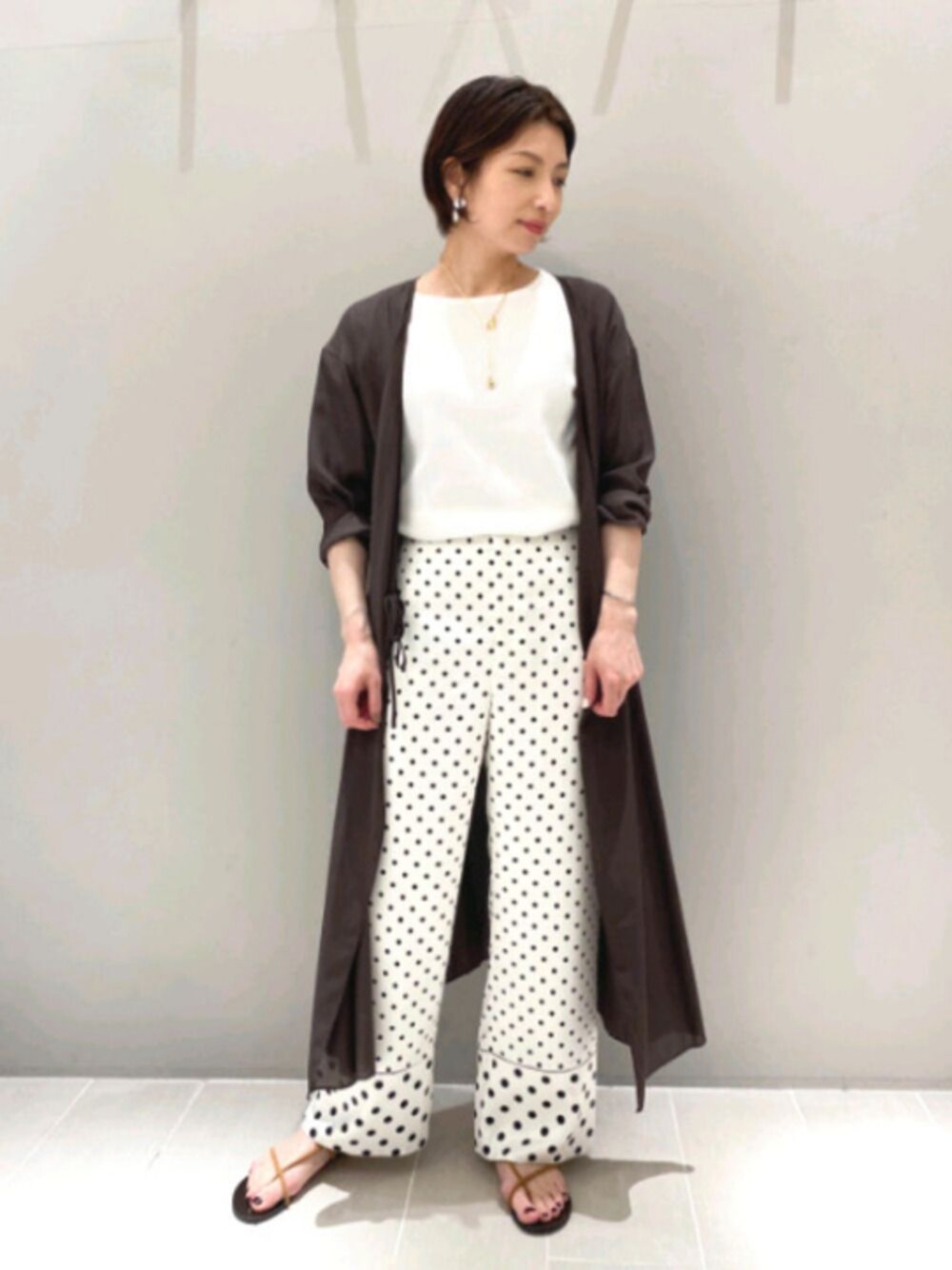 いつもご覧頂きありがとうございます。 本日は、大小のドット柄がキャッチーなストレートパンツにガウン風の羽織りを合わせた夏のリラックススタイル♪♪♪ 接触冷感の羽織りは、カシュクールとしても羽織れるので、アレンジも楽しめます(^^) ◆キュプラカシュクールガウン No.31401000203 ◇ウォッシャブルボートネックニットT5分袖 No.32400040017 ◆ドットコンビネーションパンツ No.31420050033 ◇【MOHI】ギャザーバック No.31410261011 ◆【LAOCOONTE】flavia Suedeサンダル No.31420262001 ◇【ucalypt】ネックレス No.31420263012