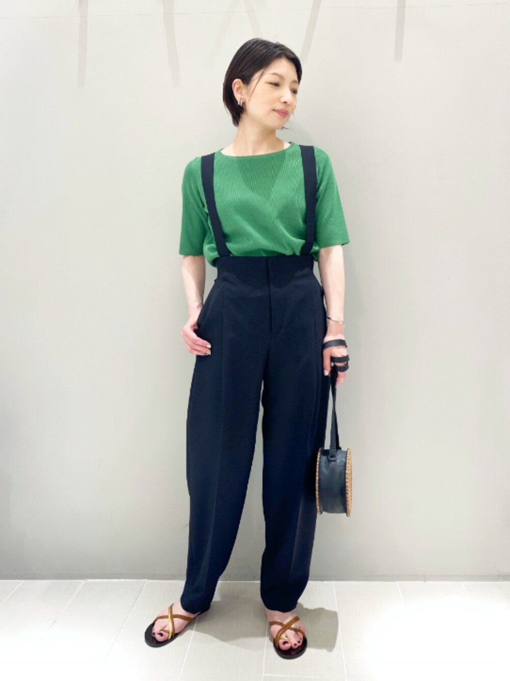 いつもご覧頂きありがとうございます!! 【ハイウエストサスペンダーパンツ】 着こなしがラクで、Tシャツを合わせただけでもスタイルアップするサスペンダーパンツ♪ qualiteのサスペンダーパンツは、フォルムに拘った他にないシルエットで、夏のスタイリングを楽しんで頂けます(^^) ◆ウォッシャブルボートネックニットT5分袖 No.32400040017 ◇ハイウエストサスペンダーパンツ No.32420050024 ◆【LAOCOONTE】Vera Suedeサンダル No.31420262002 ◇【BAGMATI】カゴショルダーBAG No.31380261019