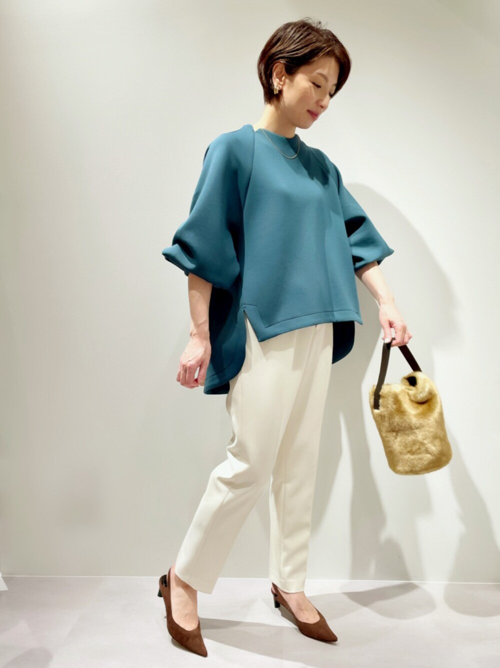 ご覧頂きありがとうございます! 新作エアリーフォルムカットソー【グリーン】♪ 秋らしい深みのあるグリーンをアイボリーのテーパードパンツで合わせることで大人っぽくクリーンな印象に。