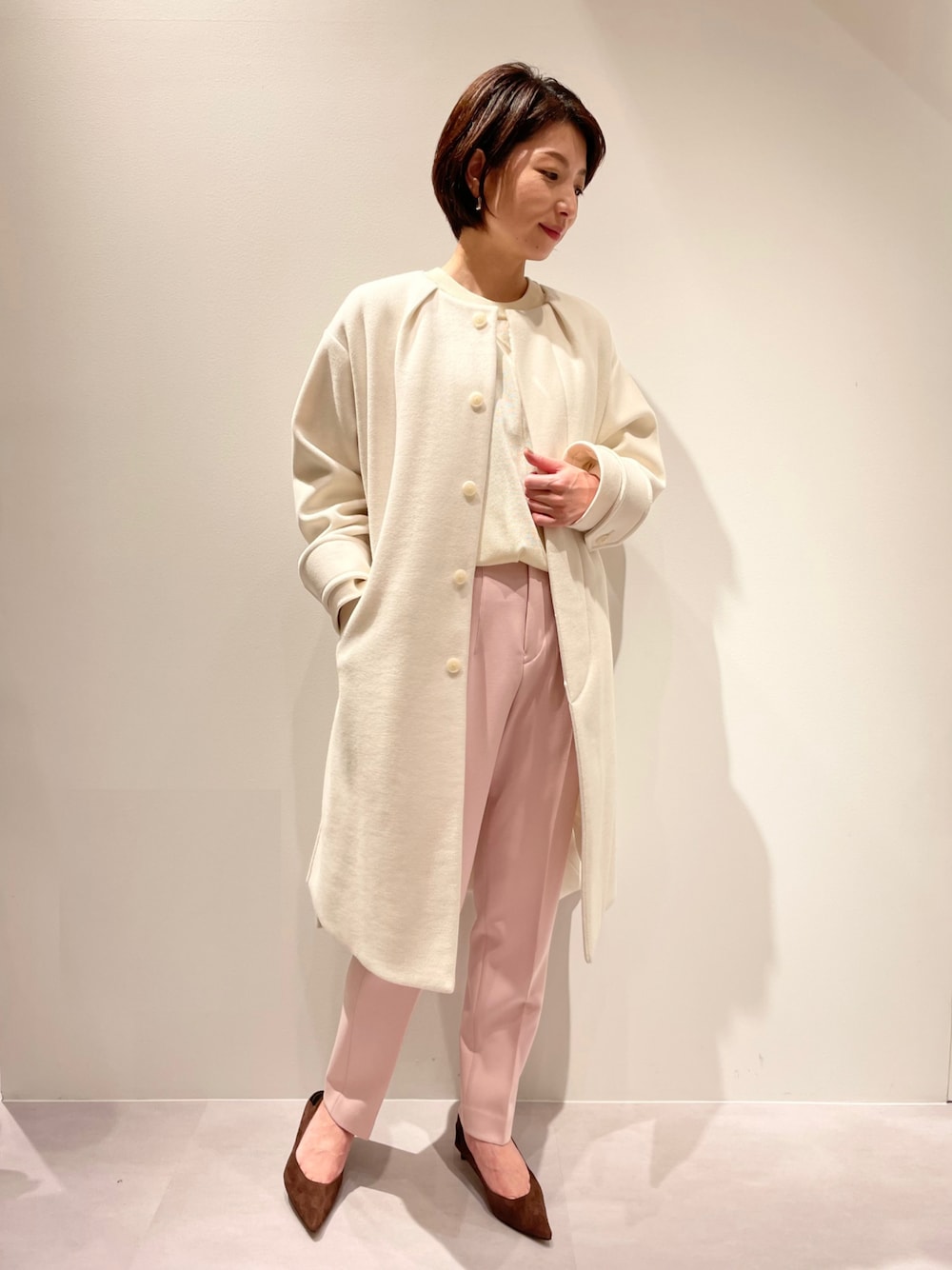 ご覧いただきありがとうございます!! カリテ新作コートが入荷しました!! 【ウールニードルノーカラーコート】 自然でキレイなAラインのバックシルエットが女性らしいレディーライクなコートです。 ボトムをスモーキーピンクで合わせたら、華やかでさらに女性らしい印象に♪ こちらのコートは、ダブルジャージ素材で、なんと自宅洗いが可能!! ニードルパンチ手法で起毛しており、とても肌触りが良いです。 春先まで着て頂けます♪