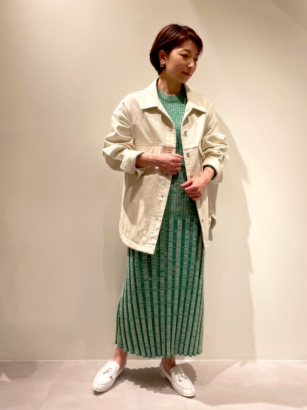 ご覧いただきありがとうございます。 以前BEIGEをご紹介しました、 【ランダムニットワンピース】GREENをご紹介いたします。 ホワイトとグリーンの糸で編んでいるニットワンピース♡ フィットし過ぎないリブと長めの丈感で、オフホワイトの【e×qualiteオーバーデニムジャケット】を羽織ったらフェミニンなカジュアルスタイルに。 2サイズ展開なので、身長やお好みのサイズ感に合わせて選んで頂けます☆