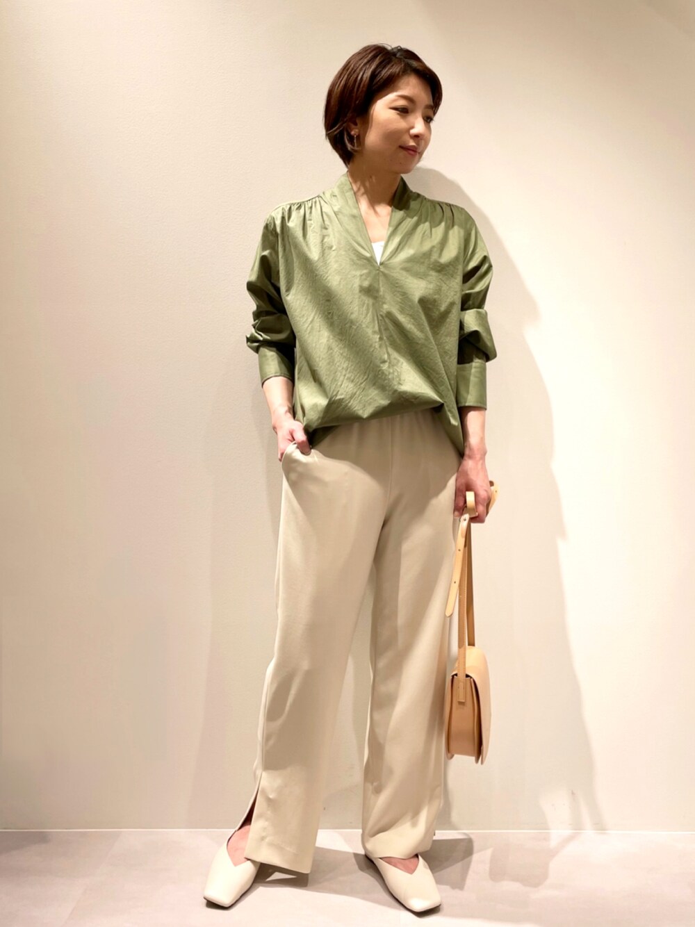 ご覧いただきありがとうございます。 穿き心地抜群のカリテイージーパンツに、サイドスリットパンツが加わりました。 定番のセミフレアパンツより少し細いシルエットでサイドスリットの抜け感があるので、今時期の足元はショートブーツで、夏はサンダル合わせがおすすめです(^^) 今から夏スタイルを想像して合わせるのが楽しみです♬ 今回は、新作【コットンローンVネックブラウス】で大人カジュアルコーデ♡ カーキとベージュの色合わせが春らしい組み合わせ♪♪♪ ジャケットやブラウスでのお仕事スタイルから、パーカーなどを合わせた休日スタイルまで、どちらでも合わせて頂ける万能パンツです!!!