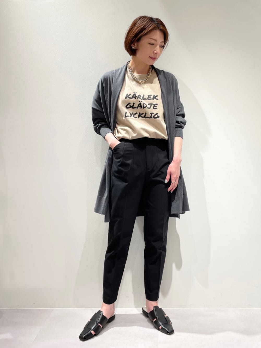 ご覧いただきありがとうございます。 新作【MARGAUX】ロゴTシャツが入荷しました!!! こちらの【MARGAUX】ロゴTシャツは、white・Beigeの2色展開。 肌に馴染むBeigeは、どんなカラーにもスタイリングしやすい大人見えするお色です。 きちんと二の腕をカバーする袖丈なので、一枚着がし易くなっております☆ 美脚シルエットの【2WAYストレッチハイウエストテーパードパンツ】に、 TシャツをINすると、脚長効果◎!!! 更に、TシャツにはGOLDショートネックレスで華やかさをプラス。 ニットカーディガンを羽織り、GWのお出かけにおすすめです(^^)