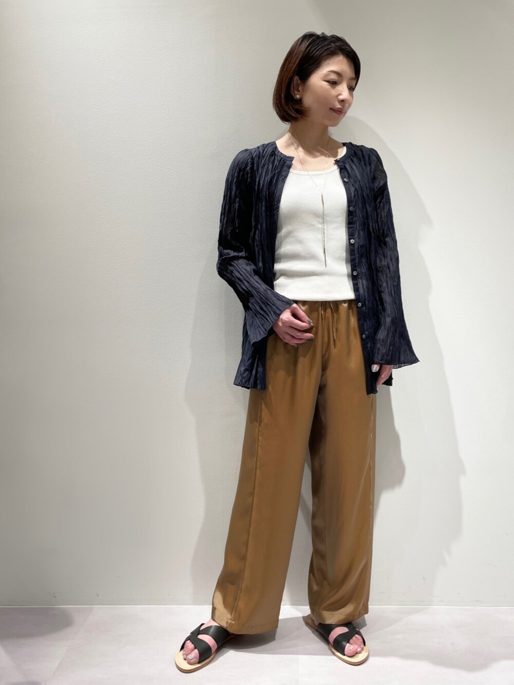 ご覧いただきありがとうございます。 ON・OFF兼用夏コーデ 【ドビーストライププリーツシャツ】 【ブライトツイルイージーパンツ】 プリーツ加工を施したシアー素材シャツに、艶のあるワイドイージーパンツで大人カジュアルコーデ♬ ベーシックカラーにブラウンを取り入れた落ち着いたカラー使いで、大人見えするカジュアルスタイルです(^^♪ 冷房や日焼け対策にもおすすめのシャツブラウス。 軽くて涼しくカジュアルに合わせても高見えするイージーパンツ。 ON・OFFどちらでも着回しが出来ますが、これからの夏の休日コーデにぜひおすすめです☆