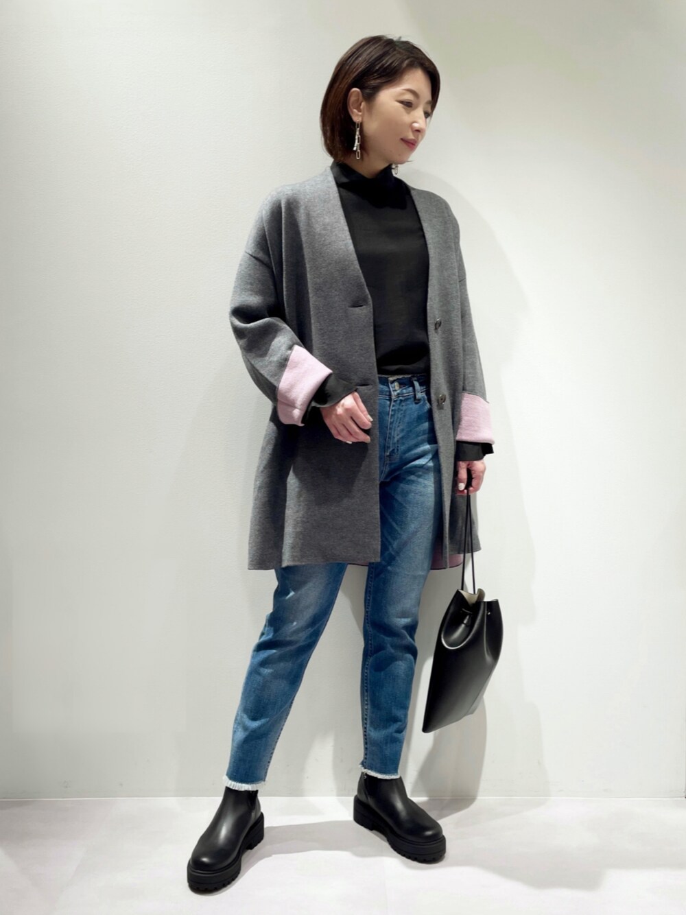 ご覧いただきありがとうございます。 【バイカラーニットアウター】コーデです♬ ゆるっと羽織れるウール混のニットアウター♡ 無地はGRYのみの展開ですが、 裏側がピンクの配色で、袖を折り返した時のバイカラーがポイントになります(^^♪ デニム×ブーツに、上品なハイネックブラウスを合わせたら、大人カジュアルなニットアウターコーデに仕上がります☆
