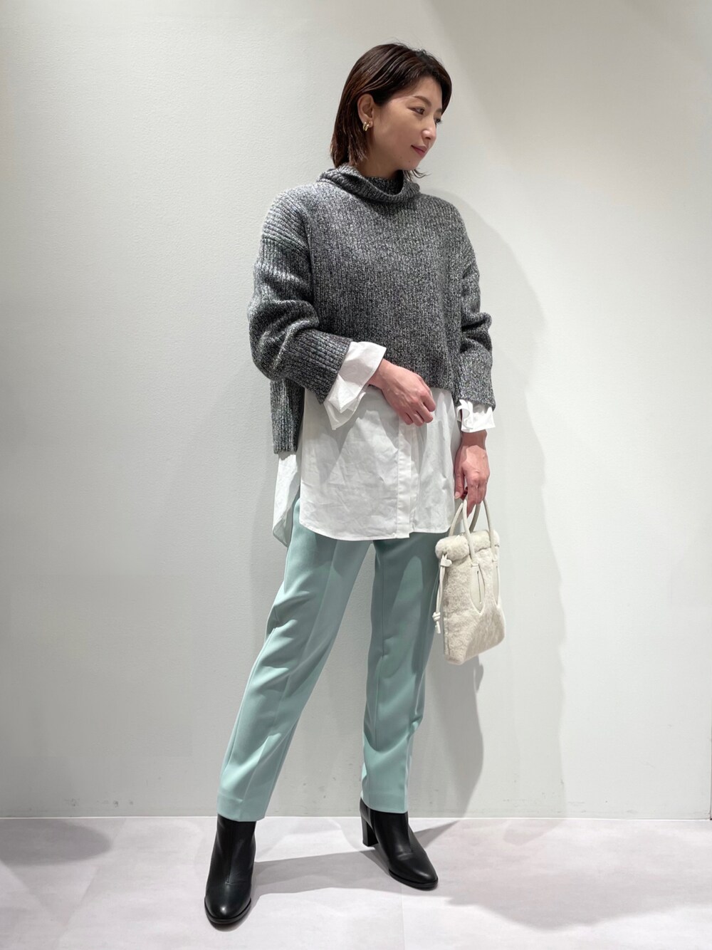 ご覧いただきありがとうございます。 【ダブルクロスハイウエストテーパードパンツ】 【シャツレイヤードニット】を合わせたカラーパンツコーデ♬ 上品で綺麗色の秋のセージグリーンパンツ♡ ニットとの間に白シャツを挟むことで、重く見えず大人カジュアルなレイヤードスタイルを楽しんで頂けます♪♪♪ グレーのタートルニットは、インナーのシャツブラウスがセットで単品でも使えて万能です(^_-)-☆