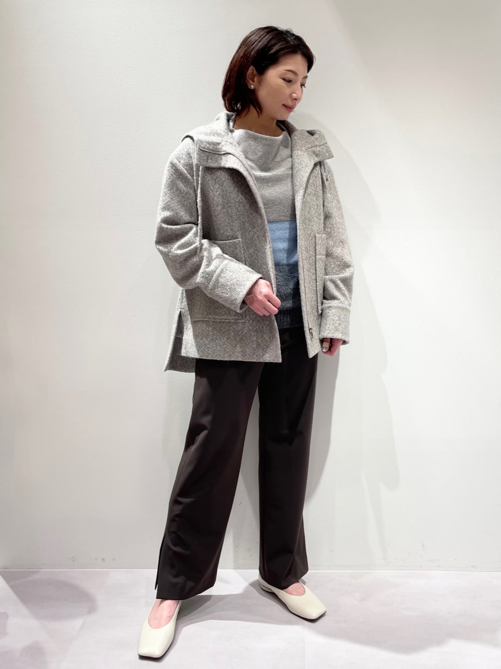 ご覧いただきありがとうございます。 冬のミドル丈コートコーデ。 コートは【ヘリンボーンツィードミドルコート】。 程よくオーバーサイズのフード付きミドル丈コート。 一見無地に見えますが、リサイクルウールで編んだヘリンボーン柄になっております。 サイドスリット入りで、ヒップや腰が隠れる前後差のあるシルエット。 カジュアルなスタイリングから通勤スタイルまで、この冬パンツやワンピースに着回し出来るミドル丈コートです☆