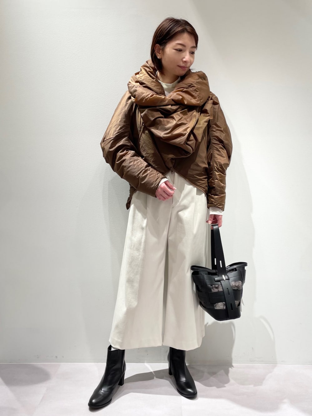 ご覧いただきありがとうございます。 ショートダウンコートコーデ♪ 羽織っているのは、軽量でとっても暖かい【2WAYダウン】 上下逆さまに着ると、ショートダウンにアレンジできます(^^♪ モード感が漂うボリューム襟は、首回りがとても暖かくストールなしでも◎ その日の気分で、トレンドのショートアウタースタイルを楽しんでいただけます。