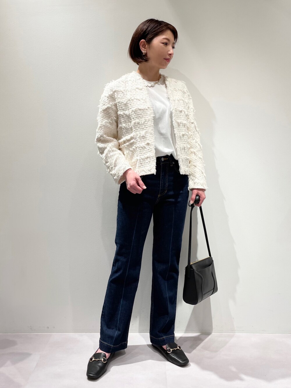 KAWAMURA(カリテ エスパル仙台東館店)のノーカラージャケット「フリンジツィードジャケット」を使ったコーディネート
