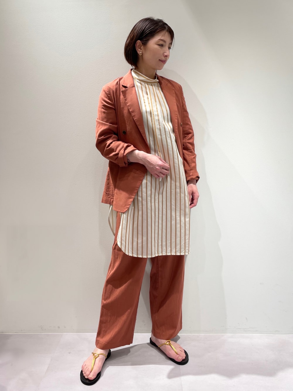 ご覧いただきありがとうございます。 新作アイテムコーデです‼︎ 昨年、春夏人気のブライトリネンシリーズが、今シーズンも新色で入荷しました♪ ブライトリネンワイドパンツ ブライトリネンジャケット 今シーズンのカラーは、テラコッタとグレー♡ リネン混ですが、チクチク感が気にならず、軽さとストレッチ素材で 抜群の着心地です。 特にパンツは、ウエストが全面ゴムで、ストレス無く穿けます!! 太過ぎないワイドシルエットは、脚のラインを拾わずスッキリと 見えるので、おすすめのパンツです(^^)!!