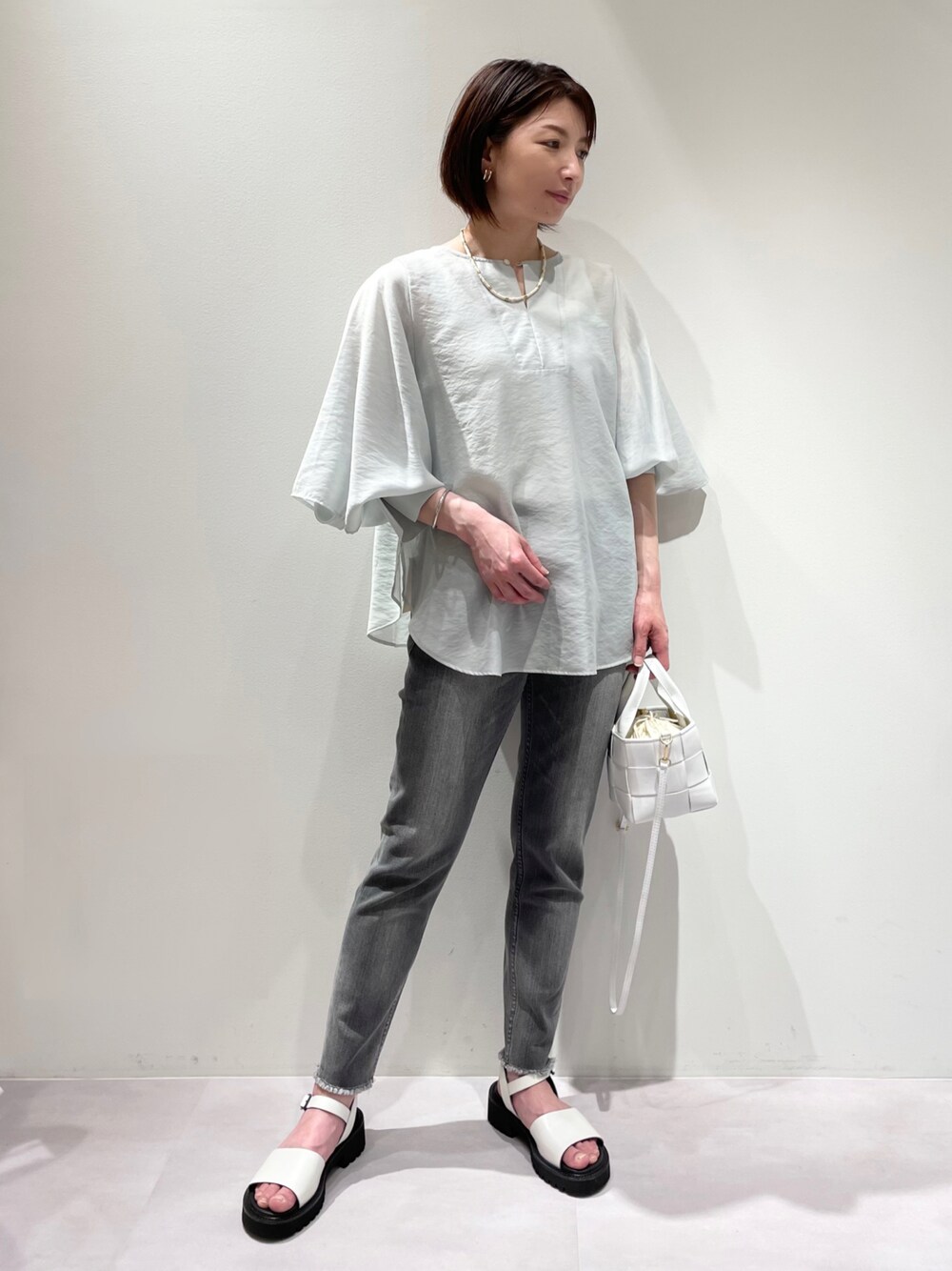ご覧いただきありがとうございます。 新作ブラウスコーデ。 クルーネックとVネックの前後2WAYで着られる 新作【2WAY】フレアスリーブブラウス♡ クルーネックを前にして着用しております♪ シアー素材で程よくシワ感のある生地を使っていて、DENIMやサンダルで、大人っぽくカジュアルなスタイルに(*^-^*) スリットが入ったボリュームスリーブは、 カフスボタンを開けてフレアスリーブにしたり、、、 ボタンを閉じて長袖や七分袖の調節ができる優秀ブラウス。 軽いので夏にも着回し出来ます(*^^)v
