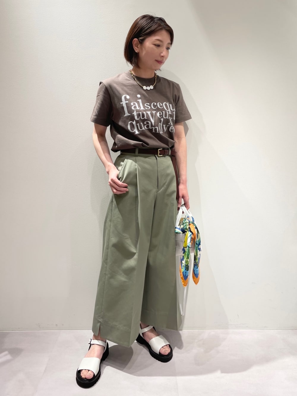 ご覧いただきありがとうございます。 新作クロップドパンツコーデ♪ カーキのワイドパンツは、新作のクロップド撥水ツィルパンツ♡ 撥水加工が施されており、汚れや梅雨時期にも安心なパンツです! 少し丈が短めなので、足首が見えてすっきりと穿いていただけます!! トップスには新作フロントロゴTシャツ。 オーバーサイズ過ぎず、程よくゆったりなサイズで、ベルト使いの今年らしい着こなしがおすすめです(*^-^*)