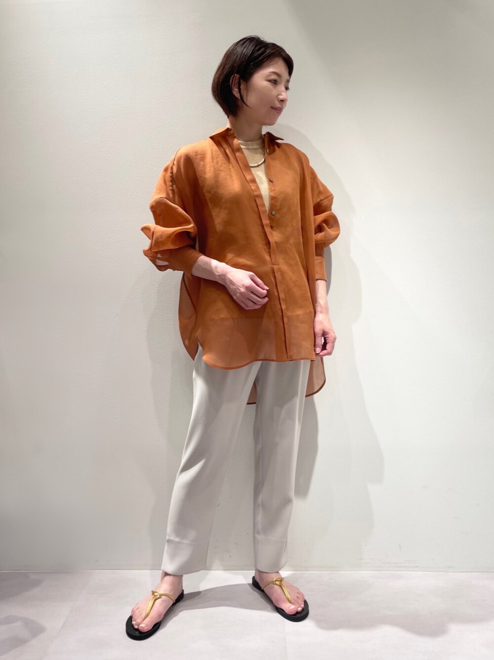 ご覧いただきありがとうございます。 新色入荷◆ソフトオーガンジードロップシャツコーデ♪ 人気のソフトオーガンジードロップシャツに新色が加わりました!! 新色は、、、 ライトグレー・テラコッタ・ネイビー。 テラコッタ色のシャツには、近いお色のオレンジ色タンクと、ベージュのドロストパンツで、ニュアンスカラーで合わせました(*^^*) ゆったりとしたサイズ感のシアーシャツは、 インナーにロンTも着れちゃうので、肌寒いは重ね着がおすすめです⭐︎