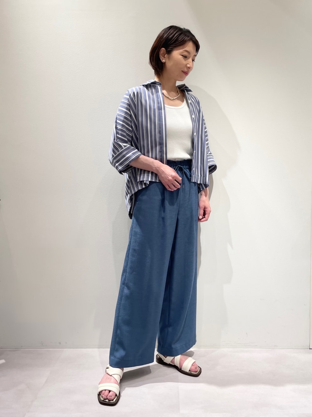 ご覧いただきありがとうございます。 新作☆ハーフスリーブフォルムシャツコーデ♪ 後ろシルエットに丸みのある新作ストライプシャツ♡ 今時期から秋口にかけて着回ししやすい七分袖丈で、接触冷感や紫外線防止の機能素材となります。 タンクトップの上にゆるりと羽織り、リラックス感のあるワイドパンツに合わせました(^-^) 微光沢素材のリネンライクワイドパンツなら、ラフになり過ぎず、大人カジュアルな着こなしに♪